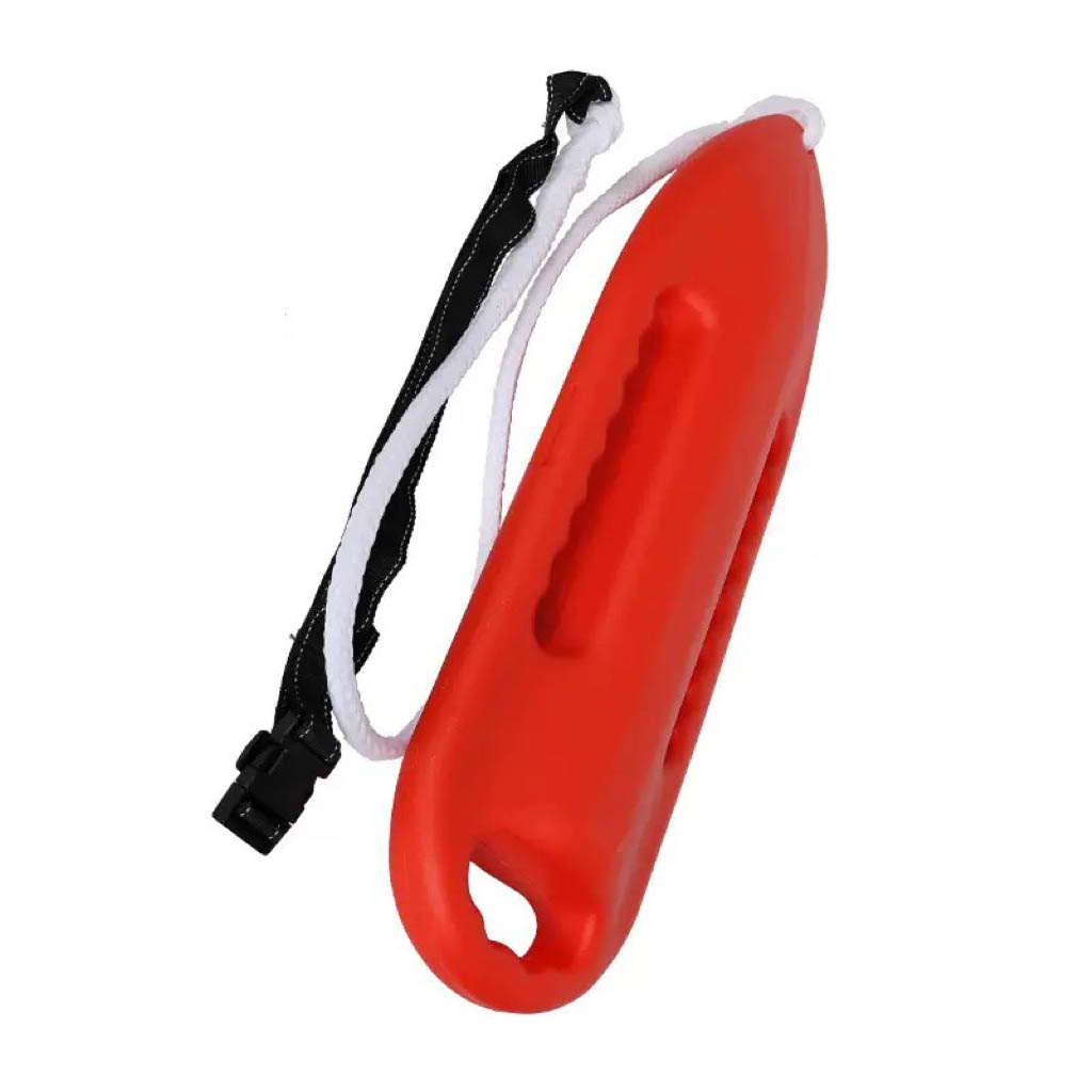 Therescue buoyor can today is a hollow plastic rescue flotation device. It is referred to also as a Torpedo Buoy, because of its shape; and is often called a "Torp" for short by lifeguards. Because of its rigidity, it is slightly more hazardous in surf conditions. However, the rescue buoy generally has more buoyancy than a rescue tube, allowing the rescuer to assist multiple victims. There are several colors and sizes available commercially. The rails, or sides, or the buoy have handles allowing victims to grab on. Like the tube, the buoy is connect by a rope to a strap the rescuer wears. This allows them to swim while towing the buoy and victim. The buoy may also be connected to a landline device, which allows individuals onshore to pull the rescuer and victims back to shore.